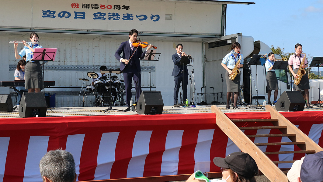 パイロットやキャビンアテンダントらで構成され、各地で演奏活動をしている。公演は空港まつりの中で実施し10人のメンバーが登場。長崎県出身の歌手で俳優の福山雅治さんや、対馬で育った歌姫MISIAさんの曲などを披露。観客の手拍子も相まって盛り上がっていた。メンバーの崔竜(チェヨン)さん(41)は公私ともに初の対馬。「空が近く、落ち着く場所」と印象を語り「公共インフラとして責任がある。事業(運航)を続けられていることに感謝したい」と述べた。